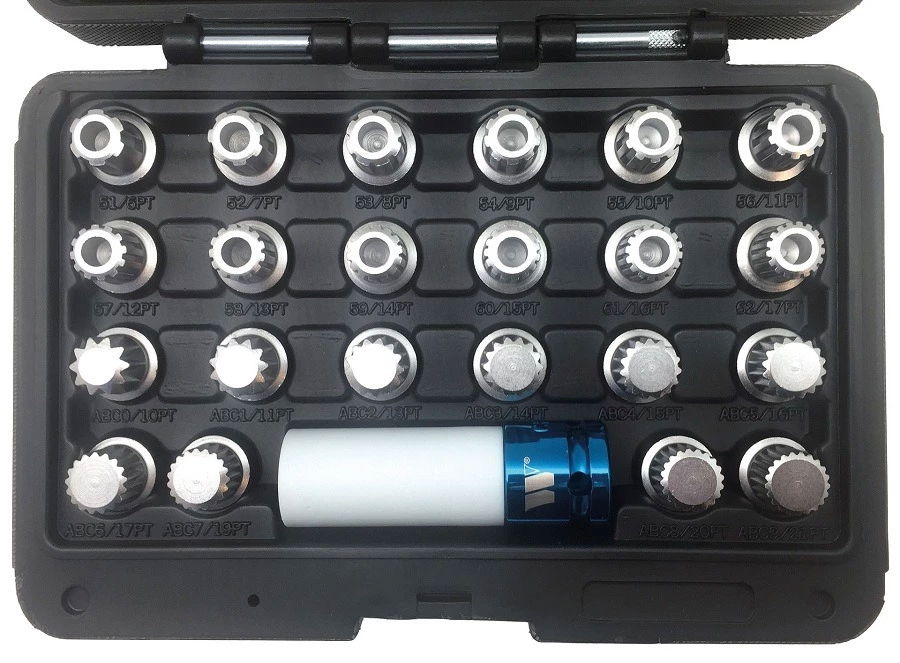 Welzh Werkzeug 4006-WW kerékőr anyacsavar leszedő kulcs készlet VAG, XZN + lyukas Ribe gyári, 23 részes